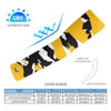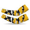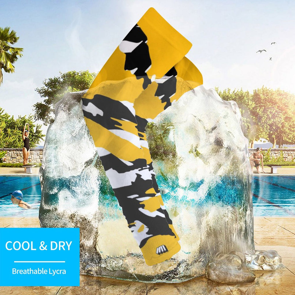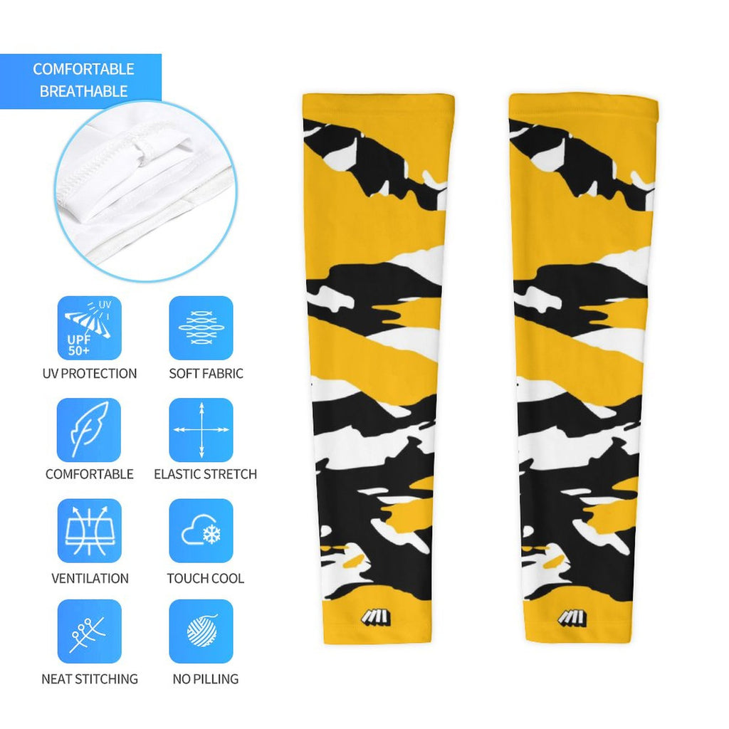 Two athletic sports compression arm/leg sleeves for baseball, softball, basketball, football, cycling, running, golf, etc. Our cooling shooting sleeves provide UV sun protection and are printed with non-fading inks to match your team colors. Smaller sizes fit youth, larger sizes fit adults. Designed for active performance with black, yellow, and white colors.