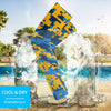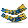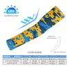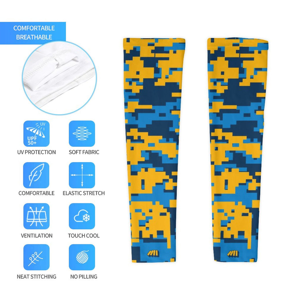 Two athletic sports compression arm/leg sleeves for baseball, softball, basketball, football, cycling, running, golf, etc. Our cooling shooting sleeves provide UV sun protection and are printed with non-fading inks to match your team colors. Smaller sizes fit youth, larger sizes fit adults. Designed for active performance with blue, light blue, and yellow colors.