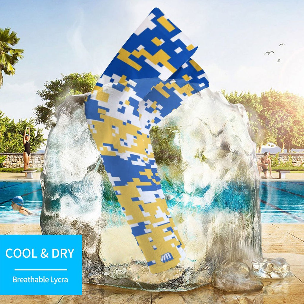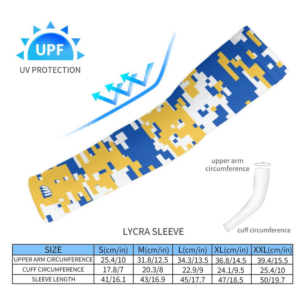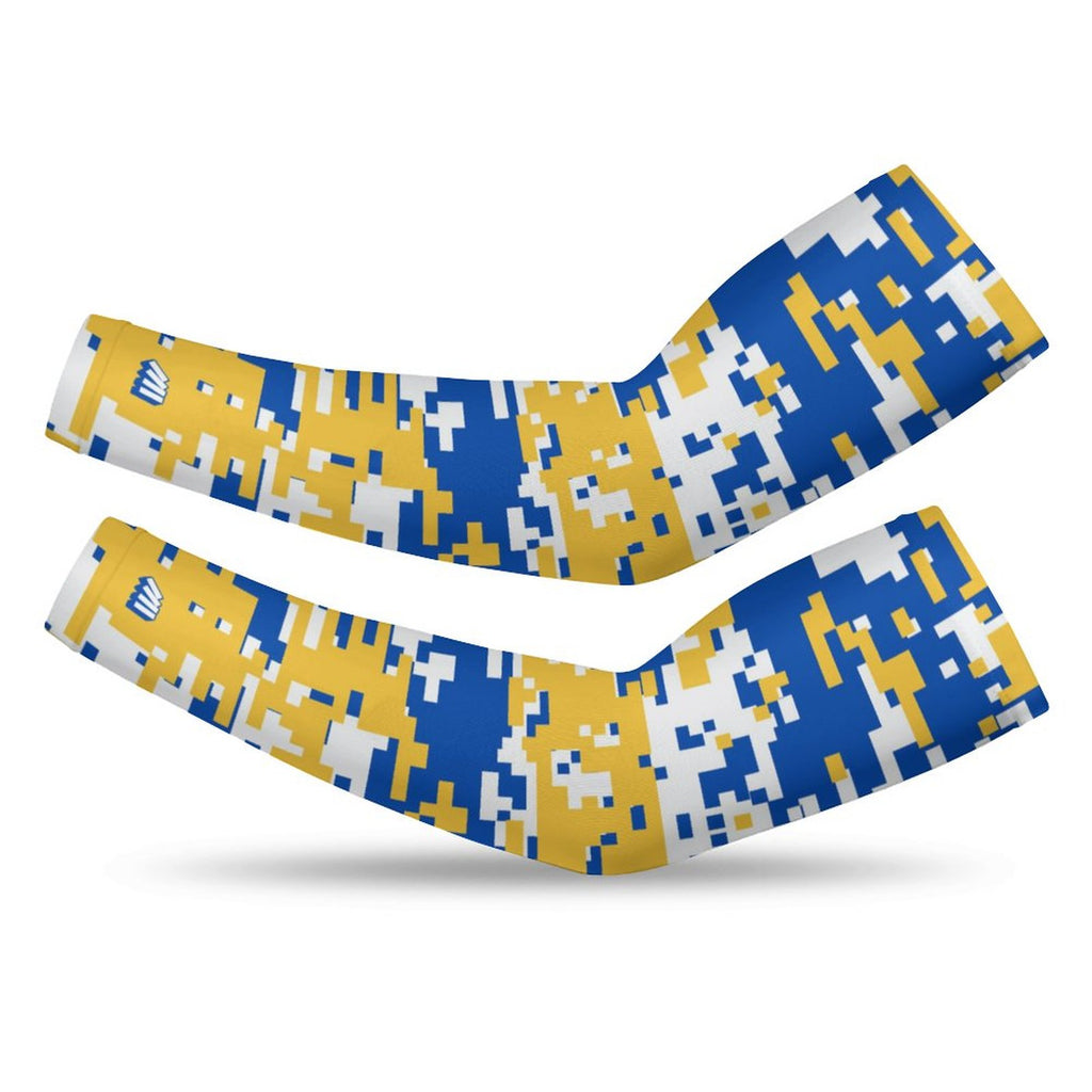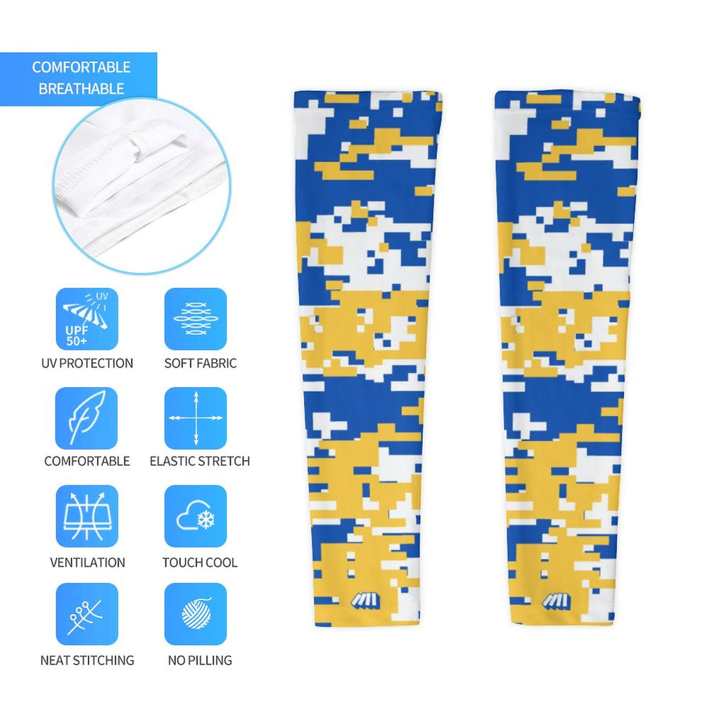 Two athletic sports compression arm/leg sleeves for baseball, softball, basketball, football, cycling, running, golf, etc. Our cooling shooting sleeves provide UV sun protection and are printed with non-fading inks to match your team colors. Smaller sizes fit youth, larger sizes fit adults. Designed for active performance with royal blue, yellow, and white colors.